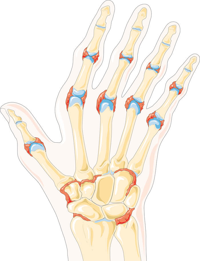 Skeleton and bones of the hand of someone with R.Arthritis. Source Wikimedia commons.